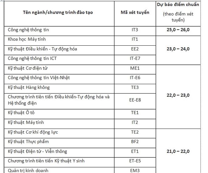 Trên cơ sở phân tích số liệu, Trường ĐH Bách Khoa Hà Nội đã đưa ra dự báo mức điểm chuẩn trúng tuyển vào các ngành/chương trình đào tạo với mục đích khuyến cáo và định hướng cho các bạn thí sinh tham khảo, để các bạn có kế hoạch điều chỉnh nguyện vọng một cách tự tin.