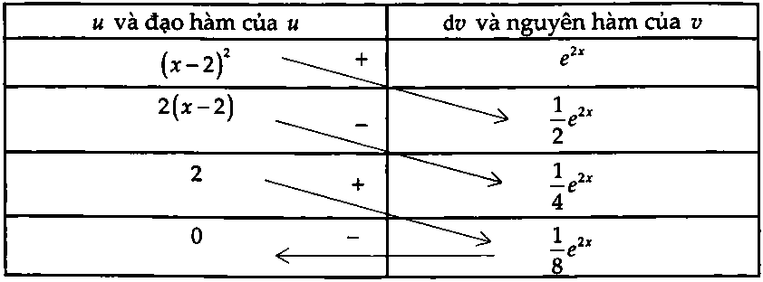 $V = \left. {\pi \left[ {\frac{{{{(x – 2)}^2}{e^{2x}}}}{2} – \frac{{(x – 2){e^{2x}}}}{2} + \frac{{{e^{2x}}}}{4}} \right]} \right|_0^2$ $ = \pi \left( {\frac{{{e^4}}}{4} – \frac{{13}}{4}} \right)$ $ \Rightarrow a = 4$, $b = – 13.$